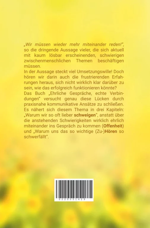 Der Autor nähert sich in seinem neuen Buch dieser wichtigen Thematik in drei Kapiteln: "Warum wir so oft lieber schweigen?", anstatt über die anstehenden Problematiken wirklich "Offen und ehrlich miteinander ins Gespräch zu kommen" und "Warum uns das so wichtige (Zu-) Hören so schwer fällt?"